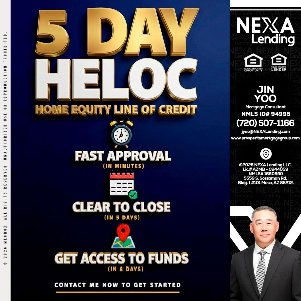 5 day hello - Jin Yoo -Mortgage ConsultantHi, my name is Jin Yoo. I’m a Loan Officer with NEXA Lending LLC., offering personalized mortgage solutions, fast customized quotes, great rates and service with integrity.